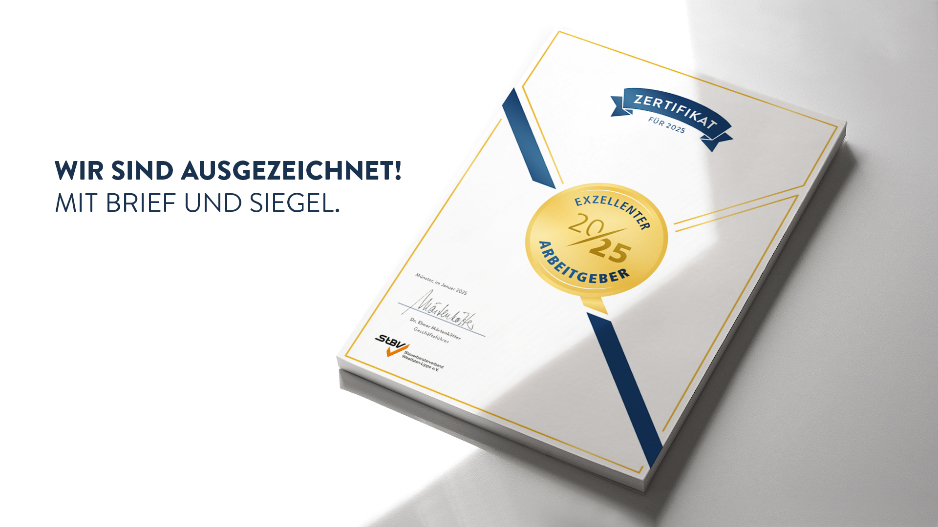 Für unser Engagement rund um unsere Mitarbeiterinnen und Mitarbeiter sind wir vom Steuerberaterverband Westfalen Lippe mit dem Qualitätssiegel „Exzellenter Arbeitgeber“ ausgezeichnet worden. Eine Anerkennung, die uns stolz macht und die uns bestärkt, auch weiterhin dafür zu sorgen, dass sich unsere Mitarbeiterinnen und Mitarbeiter – und damit auch unsere Mandanten – bei uns wohlfühlen.